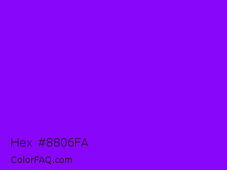 Hex #8806fa Color is a normal purple color and the nearest color is Electric Violet #8b00ff. Hex code #8806fa and RGB value is rgb(136,6,250). In RGB color space, this color is composed of 53% red, 2% green, 98% blue, In CMYK color space, this color is composed of 46% cyan, 98% magenta, 0% yellow , 2% black , In HSL color space, this color has a hue angle of 272° , 96% saturation and 50% lightness.