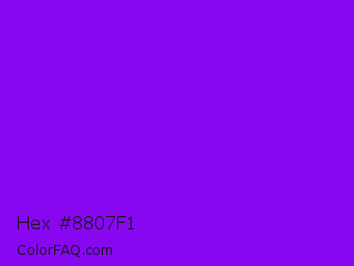 Hex #8807f1 Color is a normal purple color and the nearest color is Electric Violet #8b00ff. Hex code #8807f1 and RGB value is rgb(136,7,241). In RGB color space, this color is composed of 53% red, 3% green, 95% blue, In CMYK color space, this color is composed of 44% cyan, 97% magenta, 0% yellow , 5% black , In HSL color space, this color has a hue angle of 273° , 94% saturation and 49% lightness.