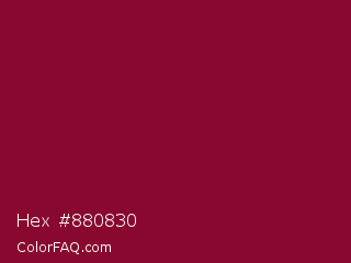Hex #880830 Color is a dark rose color and the nearest color is Paprika #8d0226. Hex code #880830 and RGB value is rgb(136,8,48). In RGB color space, this color is composed of 53% red, 3% green, 19% blue, In CMYK color space, this color is composed of 0% cyan, 94% magenta, 65% yellow , 47% black , In HSL color space, this color has a hue angle of 341° , 89% saturation and 28% lightness.