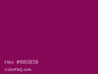 Hex #880858 Color is a dark magenta color and the nearest color is Cardinal Pink #8c055e. Hex code #880858 and RGB value is rgb(136,8,88). In RGB color space, this color is composed of 53% red, 3% green, 35% blue, In CMYK color space, this color is composed of 0% cyan, 94% magenta, 35% yellow , 47% black , In HSL color space, this color has a hue angle of 323° , 89% saturation and 28% lightness.