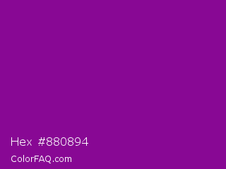 Hex #880894 Color is a normal magenta color and the nearest color is Dark Magenta #8b008b. Hex code #880894 and RGB value is rgb(136,8,148). In RGB color space, this color is composed of 53% red, 3% green, 58% blue, In CMYK color space, this color is composed of 8% cyan, 95% magenta, 0% yellow , 42% black , In HSL color space, this color has a hue angle of 295° , 90% saturation and 31% lightness.