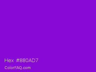 Hex #880ad7 Color is a normal purple color and the nearest color is French Violet #8806ce. Hex code #880ad7 and RGB value is rgb(136,10,215). In RGB color space, this color is composed of 53% red, 4% green, 84% blue, In CMYK color space, this color is composed of 37% cyan, 95% magenta, 0% yellow , 16% black , In HSL color space, this color has a hue angle of 277° , 91% saturation and 44% lightness.