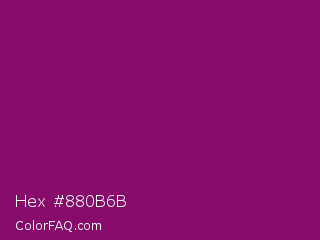 Hex #880b6b Color is a dark magenta color and the nearest color is Cardinal Pink #8c055e. Hex code #880b6b and RGB value is rgb(136,11,107). In RGB color space, this color is composed of 53% red, 4% green, 42% blue, In CMYK color space, this color is composed of 0% cyan, 92% magenta, 21% yellow , 47% black , In HSL color space, this color has a hue angle of 314° , 85% saturation and 29% lightness.