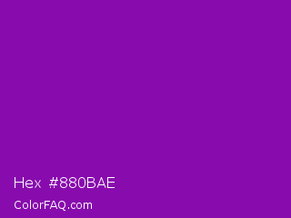 Hex #880bae Color is a normal purple color and the nearest color is Violet RYB #8601af. Hex code #880bae and RGB value is rgb(136,11,174). In RGB color space, this color is composed of 53% red, 4% green, 68% blue, In CMYK color space, this color is composed of 22% cyan, 94% magenta, 0% yellow , 32% black , In HSL color space, this color has a hue angle of 286° , 88% saturation and 36% lightness.