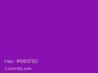 Hex #880fb0 Color is a normal purple color and the nearest color is Violet RYB #8601af. Hex code #880fb0 and RGB value is rgb(136,15,176). In RGB color space, this color is composed of 53% red, 6% green, 69% blue, In CMYK color space, this color is composed of 23% cyan, 91% magenta, 0% yellow , 31% black , In HSL color space, this color has a hue angle of 285° , 84% saturation and 37% lightness.