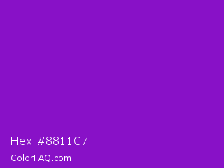 Hex #8811c7 Color is a normal purple color and the nearest color is French Violet #8806ce. Hex code #8811c7 and RGB value is rgb(136,17,199). In RGB color space, this color is composed of 53% red, 7% green, 78% blue, In CMYK color space, this color is composed of 32% cyan, 91% magenta, 0% yellow , 22% black , In HSL color space, this color has a hue angle of 279° , 84% saturation and 42% lightness.