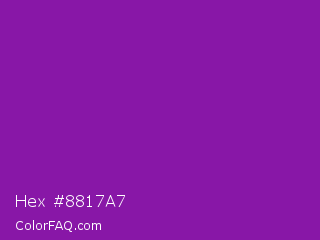 Hex #8817a7 Color is a normal purple color and the nearest color is Violet Eggplant #991199. Hex code #8817a7 and RGB value is rgb(136,23,167). In RGB color space, this color is composed of 53% red, 9% green, 65% blue, In CMYK color space, this color is composed of 19% cyan, 86% magenta, 0% yellow , 35% black , In HSL color space, this color has a hue angle of 287° , 76% saturation and 37% lightness.