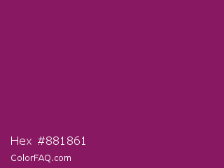 Hex #881861 Color is a normal magenta color and the nearest color is French Plum #811453. Hex code #881861 and RGB value is rgb(136,24,97). In RGB color space, this color is composed of 53% red, 9% green, 38% blue, In CMYK color space, this color is composed of 0% cyan, 82% magenta, 29% yellow , 47% black , In HSL color space, this color has a hue angle of 321° , 70% saturation and 31% lightness.