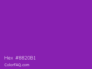 Hex #8820b1 Color is a normal purple color and the nearest color is Grape #6f2da8. Hex code #8820b1 and RGB value is rgb(136,32,177). In RGB color space, this color is composed of 53% red, 13% green, 69% blue, In CMYK color space, this color is composed of 23% cyan, 82% magenta, 0% yellow , 31% black , In HSL color space, this color has a hue angle of 283° , 69% saturation and 41% lightness.