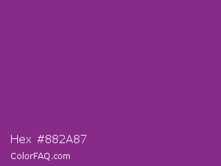 Hex #882a87 Color is a normal magenta color and the nearest color is Razzmic Berry Crayola #843179. Hex code #882a87 and RGB value is rgb(136,42,135). In RGB color space, this color is composed of 53% red, 16% green, 53% blue, In CMYK color space, this color is composed of 0% cyan, 69% magenta, 1% yellow , 47% black , In HSL color space, this color has a hue angle of 301° , 53% saturation and 35% lightness.