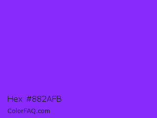 Hex #882afb Color is a normal violet color and the nearest color is Blue Violet #8a2be2. Hex code #882afb and RGB value is rgb(136,42,251). In RGB color space, this color is composed of 53% red, 16% green, 98% blue, In CMYK color space, this color is composed of 46% cyan, 83% magenta, 0% yellow , 2% black , In HSL color space, this color has a hue angle of 267° , 96% saturation and 57% lightness.