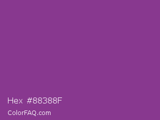 Hex #88388f Color is a normal magenta color and the nearest color is Vivid Violet #803790. Hex code #88388f and RGB value is rgb(136,56,143). In RGB color space, this color is composed of 53% red, 22% green, 56% blue, In CMYK color space, this color is composed of 5% cyan, 61% magenta, 0% yellow , 44% black , In HSL color space, this color has a hue angle of 295° , 44% saturation and 39% lightness.