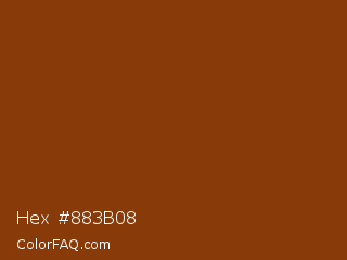 Hex #883b08 Color is a dark orange color and the nearest color is Peru Tan #7f3a02. Hex code #883b08 and RGB value is rgb(136,59,8). In RGB color space, this color is composed of 53% red, 23% green, 3% blue, In CMYK color space, this color is composed of 0% cyan, 57% magenta, 94% yellow , 47% black , In HSL color space, this color has a hue angle of 24° , 89% saturation and 28% lightness.