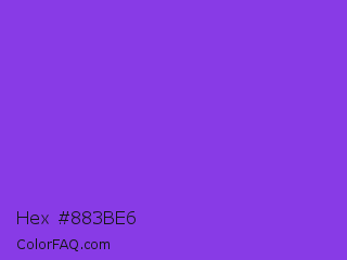 Hex #883be6 Color is a normal violet color and the nearest color is Blue Violet #8a2be2. Hex code #883be6 and RGB value is rgb(136,59,230). In RGB color space, this color is composed of 53% red, 23% green, 90% blue, In CMYK color space, this color is composed of 41% cyan, 74% magenta, 0% yellow , 10% black , In HSL color space, this color has a hue angle of 267° , 77% saturation and 57% lightness.