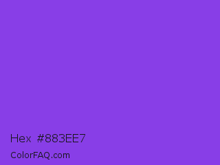 Hex #883ee7 Color is a normal violet color and the nearest color is Blue Violet #8a2be2. Hex code #883ee7 and RGB value is rgb(136,62,231). In RGB color space, this color is composed of 53% red, 24% green, 91% blue, In CMYK color space, this color is composed of 41% cyan, 73% magenta, 0% yellow , 9% black , In HSL color space, this color has a hue angle of 266° , 78% saturation and 57% lightness.