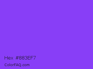 Hex #883ef7 Color is a light violet color and the nearest color is Blue Violet #8a2be2. Hex code #883ef7 and RGB value is rgb(136,62,247). In RGB color space, this color is composed of 53% red, 24% green, 97% blue, In CMYK color space, this color is composed of 45% cyan, 75% magenta, 0% yellow , 3% black , In HSL color space, this color has a hue angle of 264° , 92% saturation and 61% lightness.