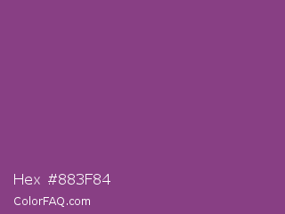 Hex #883f84 Color is a normal magenta color and the nearest color is Plum #8e4585. Hex code #883f84 and RGB value is rgb(136,63,132). In RGB color space, this color is composed of 53% red, 25% green, 52% blue, In CMYK color space, this color is composed of 0% cyan, 54% magenta, 3% yellow , 47% black , In HSL color space, this color has a hue angle of 303° , 37% saturation and 39% lightness.