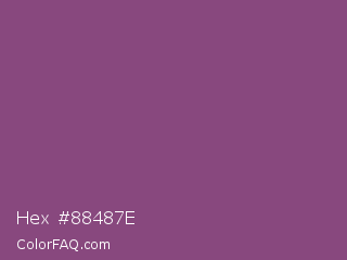 Hex #88487e Color is a normal magenta color and the nearest color is Plum #8e4585. Hex code #88487e and RGB value is rgb(136,72,126). In RGB color space, this color is composed of 53% red, 28% green, 49% blue, In CMYK color space, this color is composed of 0% cyan, 47% magenta, 7% yellow , 47% black , In HSL color space, this color has a hue angle of 309° , 31% saturation and 41% lightness.