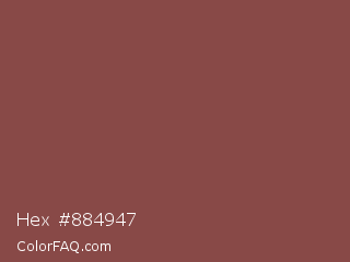 Hex #884947 Color is a normal red color and the nearest color is Cordovan #893f45. Hex code #884947 and RGB value is rgb(136,73,71). In RGB color space, this color is composed of 53% red, 29% green, 28% blue, In CMYK color space, this color is composed of 0% cyan, 46% magenta, 48% yellow , 47% black , In HSL color space, this color has a hue angle of 2° , 31% saturation and 41% lightness.