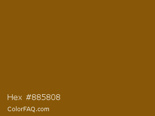 Hex #885808 Color is a dark orange color and the nearest color is Rusty Nail #86560a. Hex code #885808 and RGB value is rgb(136,88,8). In RGB color space, this color is composed of 53% red, 35% green, 3% blue, In CMYK color space, this color is composed of 0% cyan, 35% magenta, 94% yellow , 47% black , In HSL color space, this color has a hue angle of 38° , 89% saturation and 28% lightness.