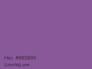 Hex #885899 Color is a normal purple color and the nearest color is Trendy Pink #8c6495. Hex code #885899 and RGB value is rgb(136,88,153). In RGB color space, this color is composed of 53% red, 35% green, 60% blue, In CMYK color space, this color is composed of 11% cyan, 42% magenta, 0% yellow , 40% black , In HSL color space, this color has a hue angle of 284° , 27% saturation and 47% lightness.