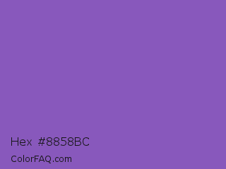 Hex #8858bc Color is a normal violet color and the nearest color is Fuchsia Blue #7a58c1. Hex code #8858bc and RGB value is rgb(136,88,188). In RGB color space, this color is composed of 53% red, 35% green, 74% blue, In CMYK color space, this color is composed of 28% cyan, 53% magenta, 0% yellow , 26% black , In HSL color space, this color has a hue angle of 269° , 43% saturation and 54% lightness.
