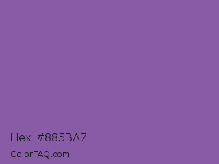 Hex #885ba7 Color is a normal purple color and the nearest color is Royal Purple #7851a9. Hex code #885ba7 and RGB value is rgb(136,91,167). In RGB color space, this color is composed of 53% red, 36% green, 65% blue, In CMYK color space, this color is composed of 19% cyan, 46% magenta, 0% yellow , 35% black , In HSL color space, this color has a hue angle of 276° , 30% saturation and 51% lightness.