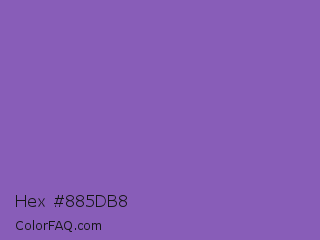 Hex #885db8 Color is a normal violet color and the nearest color is Fuchsia Blue #7a58c1. Hex code #885db8 and RGB value is rgb(136,93,184). In RGB color space, this color is composed of 53% red, 36% green, 72% blue, In CMYK color space, this color is composed of 26% cyan, 49% magenta, 0% yellow , 28% black , In HSL color space, this color has a hue angle of 268° , 39% saturation and 54% lightness.
