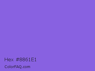 Hex #8861e1 Color is a light indigo color and the nearest color is Navy Purple #9457eb. Hex code #8861e1 and RGB value is rgb(136,97,225). In RGB color space, this color is composed of 53% red, 38% green, 88% blue, In CMYK color space, this color is composed of 40% cyan, 57% magenta, 0% yellow , 12% black , In HSL color space, this color has a hue angle of 258° , 68% saturation and 63% lightness.