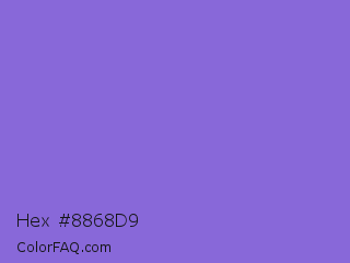 Hex #8868d9 Color is a light indigo color and the nearest color is True V #8a73d6. Hex code #8868d9 and RGB value is rgb(136,104,217). In RGB color space, this color is composed of 53% red, 41% green, 85% blue, In CMYK color space, this color is composed of 37% cyan, 52% magenta, 0% yellow , 15% black , In HSL color space, this color has a hue angle of 257° , 60% saturation and 63% lightness.