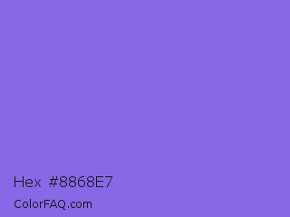 Hex #8868e7 Color is a light indigo color and the nearest color is Medium Slate Blue #7b68ee. Hex code #8868e7 and RGB value is rgb(136,104,231). In RGB color space, this color is composed of 53% red, 41% green, 91% blue, In CMYK color space, this color is composed of 41% cyan, 55% magenta, 0% yellow , 9% black , In HSL color space, this color has a hue angle of 255° , 73% saturation and 66% lightness.