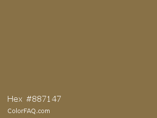 Hex #887147 Color is a normal orange color and the nearest color is French Bistre #856d4d. Hex code #887147 and RGB value is rgb(136,113,71). In RGB color space, this color is composed of 53% red, 44% green, 28% blue, In CMYK color space, this color is composed of 0% cyan, 17% magenta, 48% yellow , 47% black , In HSL color space, this color has a hue angle of 39° , 31% saturation and 41% lightness.