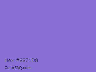 Hex #8871d8 Color is a light indigo color and the nearest color is True V #8a73d6. Hex code #8871d8 and RGB value is rgb(136,113,216). In RGB color space, this color is composed of 53% red, 44% green, 85% blue, In CMYK color space, this color is composed of 37% cyan, 48% magenta, 0% yellow , 15% black , In HSL color space, this color has a hue angle of 253° , 57% saturation and 65% lightness.