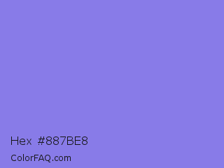 Hex #887be8 Color is a light indigo color and the nearest color is Chetwode Blue #8581d9. Hex code #887be8 and RGB value is rgb(136,123,232). In RGB color space, this color is composed of 53% red, 48% green, 91% blue, In CMYK color space, this color is composed of 41% cyan, 47% magenta, 0% yellow , 9% black , In HSL color space, this color has a hue angle of 247° , 70% saturation and 70% lightness.