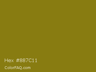 Hex #887c11 Color is a dark yellow color and the nearest color is Corn Harvest #8b6b0b. Hex code #887c11 and RGB value is rgb(136,124,17). In RGB color space, this color is composed of 53% red, 49% green, 7% blue, In CMYK color space, this color is composed of 0% cyan, 9% magenta, 88% yellow , 47% black , In HSL color space, this color has a hue angle of 54° , 78% saturation and 30% lightness.