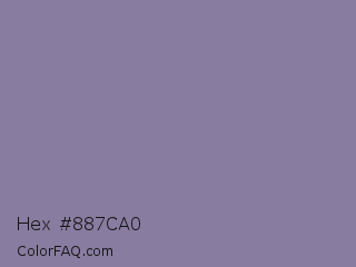Hex #887ca0 Color is a normal indigo color and the nearest color is Roman Silver #838996. Hex code #887ca0 and RGB value is rgb(136,124,160). In RGB color space, this color is composed of 53% red, 49% green, 63% blue, In CMYK color space, this color is composed of 15% cyan, 23% magenta, 0% yellow , 37% black , In HSL color space, this color has a hue angle of 260° , 16% saturation and 56% lightness.