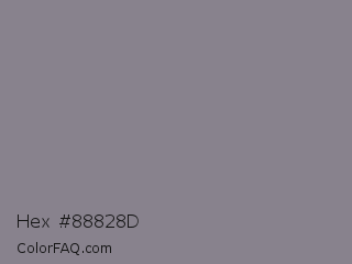 Hex #88828d Color is a normal purple color and the nearest color is Monsoon #8a8389. Hex code #88828d and RGB value is rgb(136,130,141). In RGB color space, this color is composed of 53% red, 51% green, 55% blue, In CMYK color space, this color is composed of 4% cyan, 8% magenta, 0% yellow , 45% black , In HSL color space, this color has a hue angle of 273° , 5% saturation and 53% lightness.