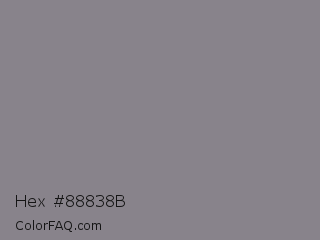 Hex #88838b Color is a normal purple color and the nearest color is Monsoon #8a8389. Hex code #88838b and RGB value is rgb(136,131,139). In RGB color space, this color is composed of 53% red, 51% green, 55% blue, In CMYK color space, this color is composed of 2% cyan, 6% magenta, 0% yellow , 45% black , In HSL color space, this color has a hue angle of 278° , 3% saturation and 53% lightness.