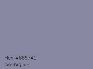 Hex #8887a1 Color is a normal indigo color and the nearest color is Manatee Crayola #8d90a1. Hex code #8887a1 and RGB value is rgb(136,135,161). In RGB color space, this color is composed of 53% red, 53% green, 63% blue, In CMYK color space, this color is composed of 16% cyan, 16% magenta, 0% yellow , 37% black , In HSL color space, this color has a hue angle of 242° , 12% saturation and 58% lightness.
