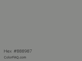 Hex #888987 Color is a normal green color and the nearest color is Taupe Gray #8b8589. Hex code #888987 and RGB value is rgb(136,137,135). In RGB color space, this color is composed of 53% red, 54% green, 53% blue, In CMYK color space, this color is composed of 1% cyan, 0% magenta, 1% yellow , 46% black , In HSL color space, this color has a hue angle of 90° , 1% saturation and 53% lightness.