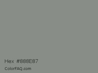Hex #888e87 Color is a normal green color and the nearest color is Stack #8a8f8a. Hex code #888e87 and RGB value is rgb(136,142,135). In RGB color space, this color is composed of 53% red, 56% green, 53% blue, In CMYK color space, this color is composed of 4% cyan, 0% magenta, 5% yellow , 44% black , In HSL color space, this color has a hue angle of 111° , 3% saturation and 54% lightness.