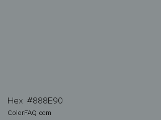 Hex #888e90 Color is a normal blue color and the nearest color is Oslo Gray #878d91. Hex code #888e90 and RGB value is rgb(136,142,144). In RGB color space, this color is composed of 53% red, 56% green, 56% blue, In CMYK color space, this color is composed of 6% cyan, 1% magenta, 0% yellow , 44% black , In HSL color space, this color has a hue angle of 195° , 3% saturation and 55% lightness.