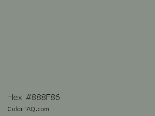 Hex #888f86 Color is a normal green color and the nearest color is Stack #8a8f8a. Hex code #888f86 and RGB value is rgb(136,143,134). In RGB color space, this color is composed of 53% red, 56% green, 53% blue, In CMYK color space, this color is composed of 5% cyan, 0% magenta, 6% yellow , 44% black , In HSL color space, this color has a hue angle of 107° , 4% saturation and 54% lightness.