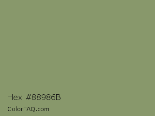 Hex #88986b Color is a normal green color and the nearest color is Avocado Pulp #888d65. Hex code #88986b and RGB value is rgb(136,152,107). In RGB color space, this color is composed of 53% red, 60% green, 42% blue, In CMYK color space, this color is composed of 11% cyan, 0% magenta, 30% yellow , 40% black , In HSL color space, this color has a hue angle of 81° , 18% saturation and 51% lightness.
