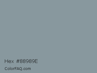 Hex #88989e Color is a normal blue color and the nearest color is Regent Gray #86949f. Hex code #88989e and RGB value is rgb(136,152,158). In RGB color space, this color is composed of 53% red, 60% green, 62% blue, In CMYK color space, this color is composed of 14% cyan, 4% magenta, 0% yellow , 38% black , In HSL color space, this color has a hue angle of 196° , 10% saturation and 58% lightness.