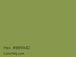 Hex #88994d Color is a normal lime color and the nearest color is Moss Green #8a9a5b. Hex code #88994d and RGB value is rgb(136,153,77). In RGB color space, this color is composed of 53% red, 60% green, 30% blue, In CMYK color space, this color is composed of 11% cyan, 0% magenta, 50% yellow , 40% black , In HSL color space, this color has a hue angle of 73° , 33% saturation and 45% lightness.