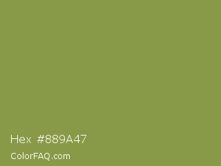 Hex #889a47 Color is a normal lime color and the nearest color is Moss Green #8a9a5b. Hex code #889a47 and RGB value is rgb(136,154,71). In RGB color space, this color is composed of 53% red, 60% green, 28% blue, In CMYK color space, this color is composed of 12% cyan, 0% magenta, 54% yellow , 40% black , In HSL color space, this color has a hue angle of 73° , 37% saturation and 44% lightness.