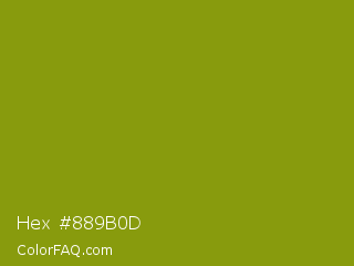 Hex #889b0d Color is a normal yellow color and the nearest color is Trendy Green #7c881a. Hex code #889b0d and RGB value is rgb(136,155,13). In RGB color space, this color is composed of 53% red, 61% green, 5% blue, In CMYK color space, this color is composed of 12% cyan, 0% magenta, 92% yellow , 39% black , In HSL color space, this color has a hue angle of 68° , 85% saturation and 33% lightness.