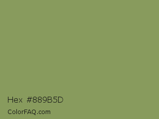 Hex #889b5d Color is a normal lime color and the nearest color is Moss Green #8a9a5b. Hex code #889b5d and RGB value is rgb(136,155,93). In RGB color space, this color is composed of 53% red, 61% green, 36% blue, In CMYK color space, this color is composed of 12% cyan, 0% magenta, 40% yellow , 39% black , In HSL color space, this color has a hue angle of 78° , 25% saturation and 49% lightness.