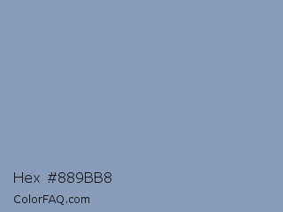 Hex #889bb8 Color is a light blue color and the nearest color is Bali Hai #859faf. Hex code #889bb8 and RGB value is rgb(136,155,184). In RGB color space, this color is composed of 53% red, 61% green, 72% blue, In CMYK color space, this color is composed of 26% cyan, 16% magenta, 0% yellow , 28% black , In HSL color space, this color has a hue angle of 216° , 25% saturation and 63% lightness.